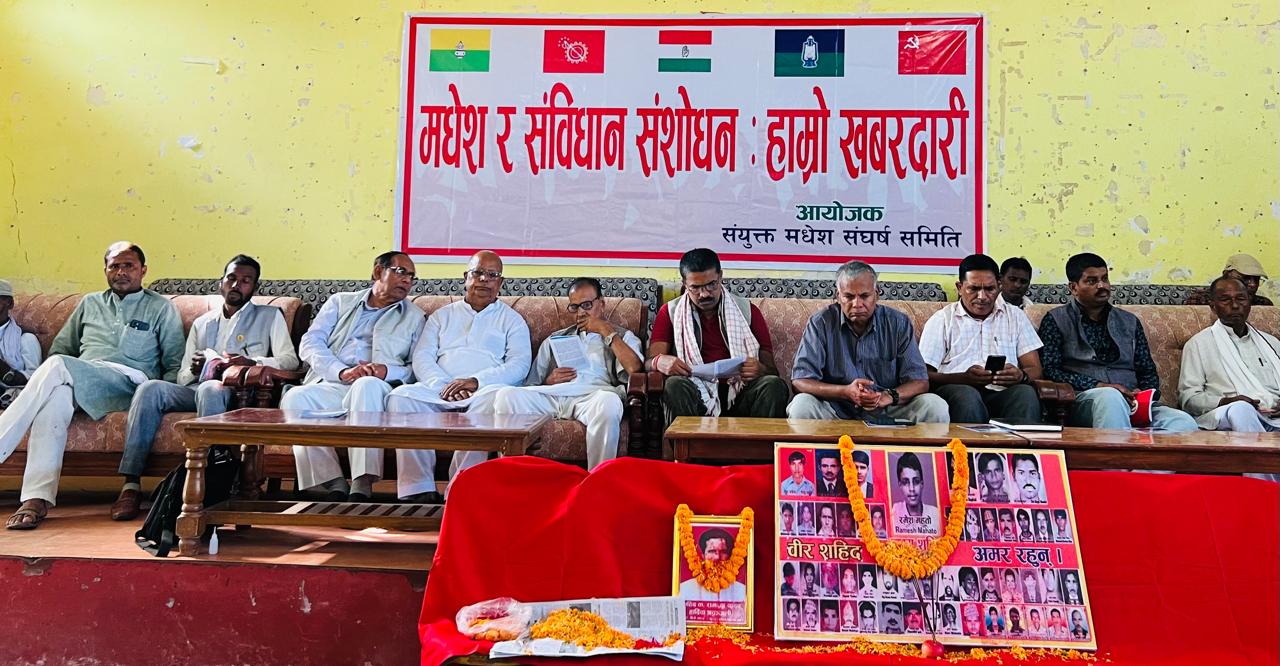 संयुक्त मधेश संघर्ष समितिले आज महोत्तरीको जलेश्वरमा नेपाली काँग्रेस र नेकपा एमाले द्वारा प्रस्तावित संविधान संशोधनको बिरुद्ध खबरदारी सभा गरेको छ । संयुक्त मधेश संघर्ष समिति प्रतिनिधि सभाबाट समानुपातिक समावेशी प्रतिनिधित्व हटाउने, थ्रेसहोल्डलाई १०% सम्म बढाउने, राष्ट्रिय सभाको वर्तमान प्रतिनिधित्वको स्वरुप बदल्ने जस्ता कुरालाई संविधानको प्रतिगामी संशोधनको प्रस्ताव भनेको छ । पहिचान आधारित प्रदेशको सीमांकन,पूर्ण समावेशी समानुपातिक पद्धति र निर्वाचन क्षेत्रको रुपमा प्रदेश, थ्रेस होल्डको समाप्ति, राष्ट्रिय सभाको वर्तमान स्वरुपमै जनसंख्याको हिसाबले प्रदेशहरुबाट प्रतिनिधित्व, प्रादेशिक राजनीतिक दलहरुको मान्यता, तथा राज्यका अंगहरुमा समानुपातिक समावेशी उपस्थिति संयुक्त मधेश संघर्ष समितिका मांगहर रहेका छन् । समितिमा तराई-मधेश लोकतान्त्रिक पार्टी, मधेशी राष्ट्रीय मुक्ति मोर्चा नेपाल, नेपाल सद्भावना पार्टी, जनअधिकार पार्टी र एकीकृत समाजवादी पार्टीका समान विचारका नेताहरू शामिल छन् । समितिले यस अघि भाद्र ३१ गते धनुषाको जनकपुरधाममा पहिलो खबरदारी सभा गरेको थियो । मधेशको ठूलो पर्व छठ सकिने बित्तिक्कै सबै जिल्लाहरु खबरदारी सभा सम्पन्न गर्ने र त्यसपछि कार्यक्रमको अर्को चरणमा प्रवेश गर्ने तमलोपाका प्रचार विभाग प्रमुख उमेश मण्डल ले बताए ।